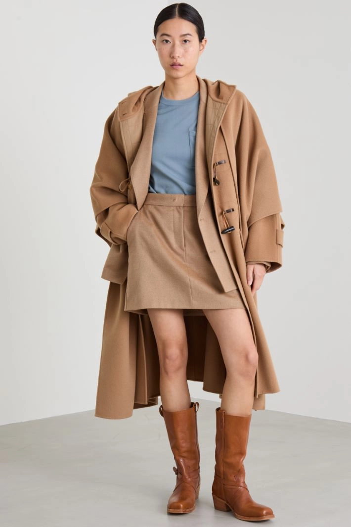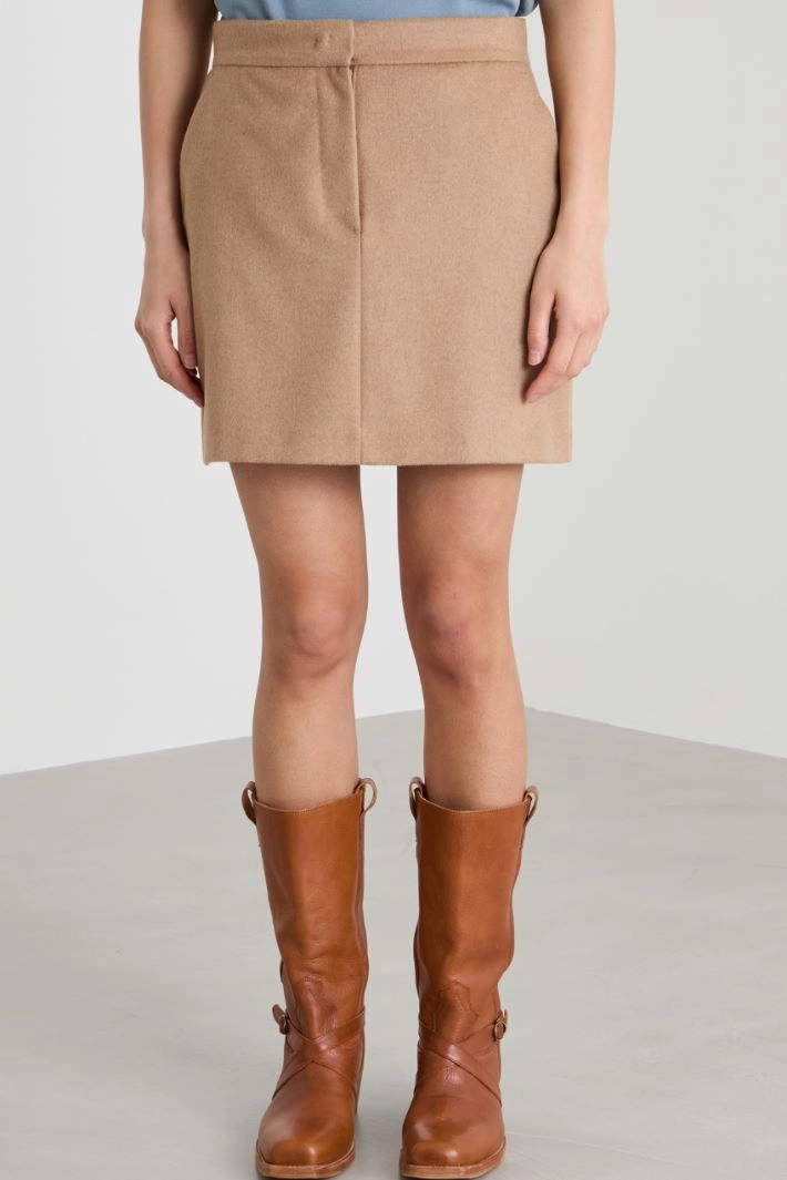 Straight-fit mini skirt in pure sable camel drap, with topstitching side French pockets and buttoned welt pockets on the back, hidden fastening with zip, button and hooks.