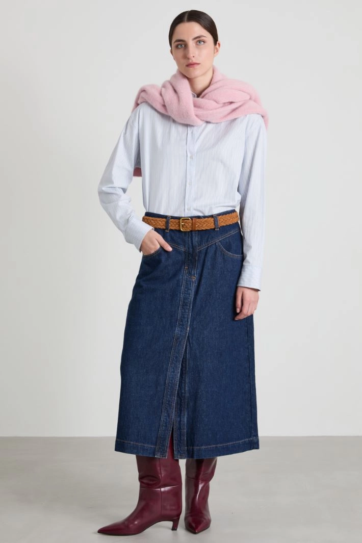 Slightly flared midi skirt in pure cotton denim, with belt loops, French pockets at the front and patch pockets at the back, and a slit at the center front. Zip and snap button fastening.