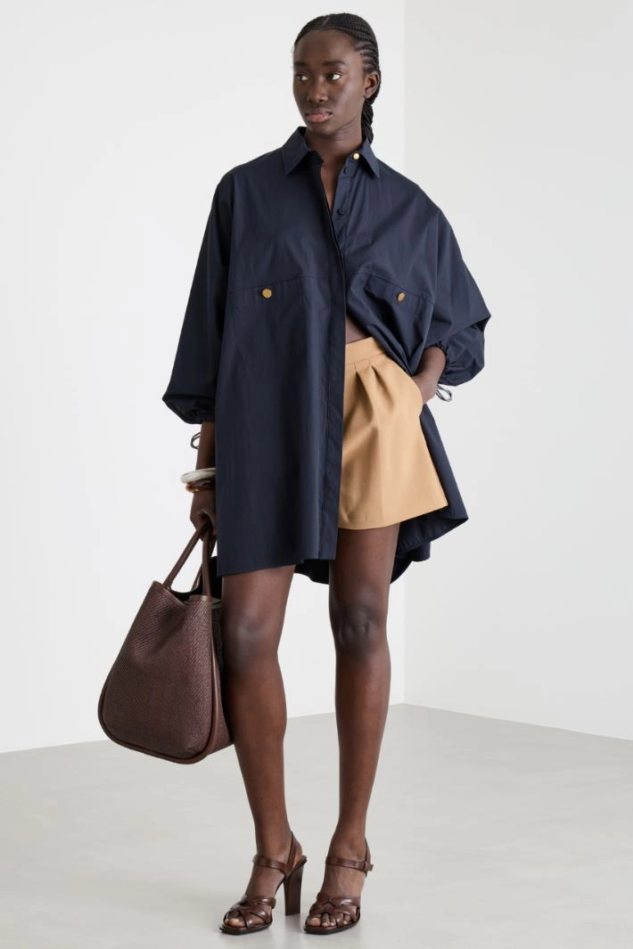A short, oversized dress in cotton poplin, defined by a point collar and wide, long sleeves with a kimono-style front and raglan construction at the back. The cuffs are adjusted by a drawstring cord finished with metal ends. The design is further detailed with small side slits, patch pockets on the chest with metal buttons, and a fabric cord threaded through metal eyelets at the back of the neck. A concealed front button fastening completes the piece.