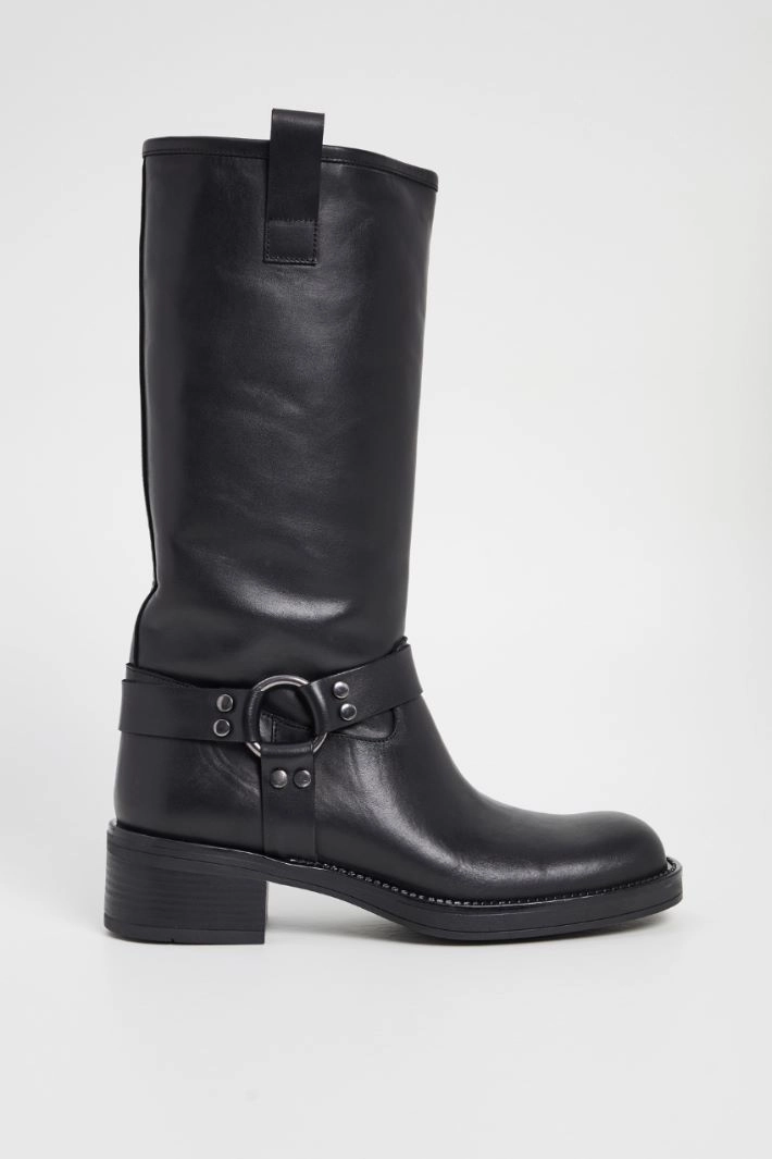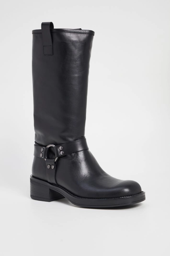 Biker style boots in genuine leather, with ankle strap details and rounded toe. Rubber sole.