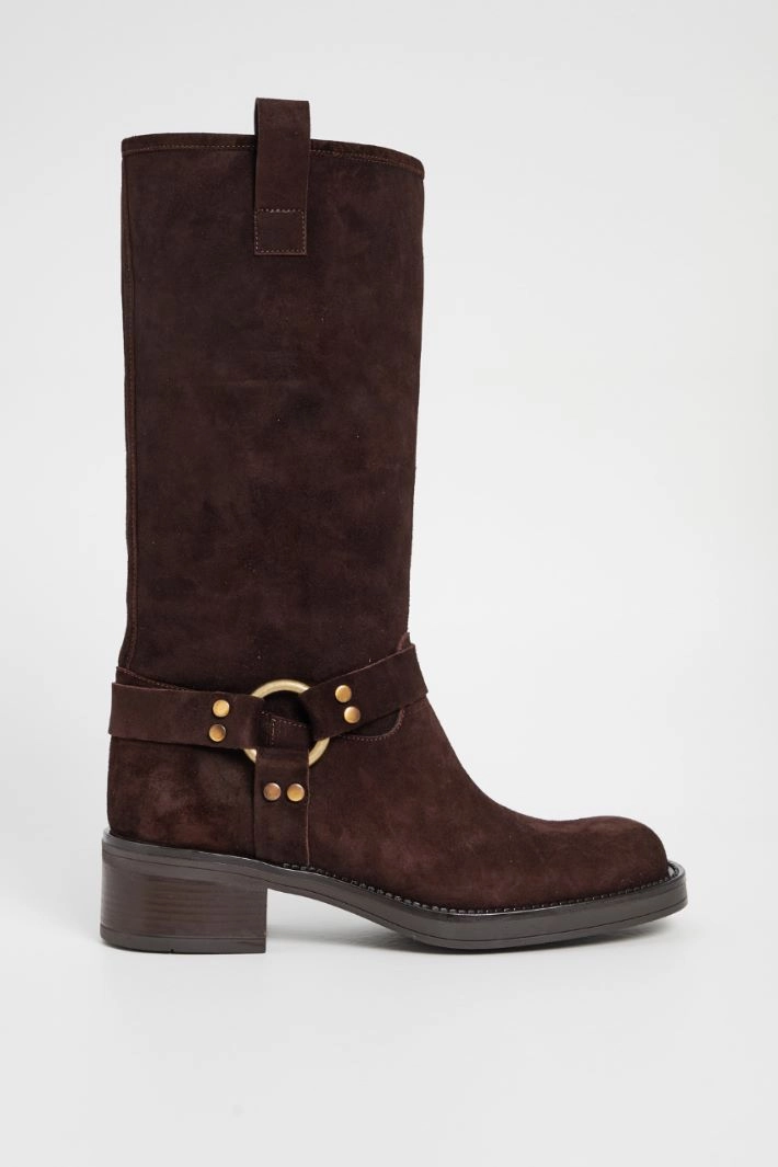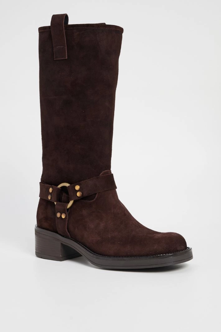 Biker style boots in genuine suede, ankle strap details and rounded toe. Leather lining and rubber sole.