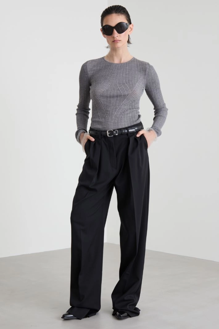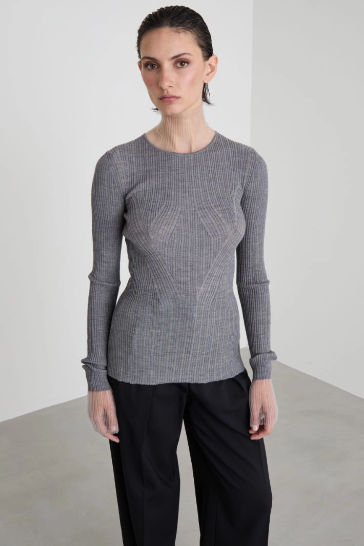 Semi-fitted ribbed turtleneck in pure wool yarn, with transparent mesh insert on the collar and cuffs, high collar and long sleeves.