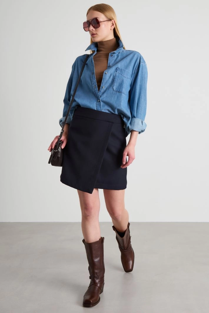Short, flared wrap skirt in heavy wool blend canvas, with inset side pockets and single double welt at the back, and crossover fastening with button and hook. Lined.