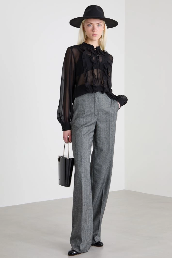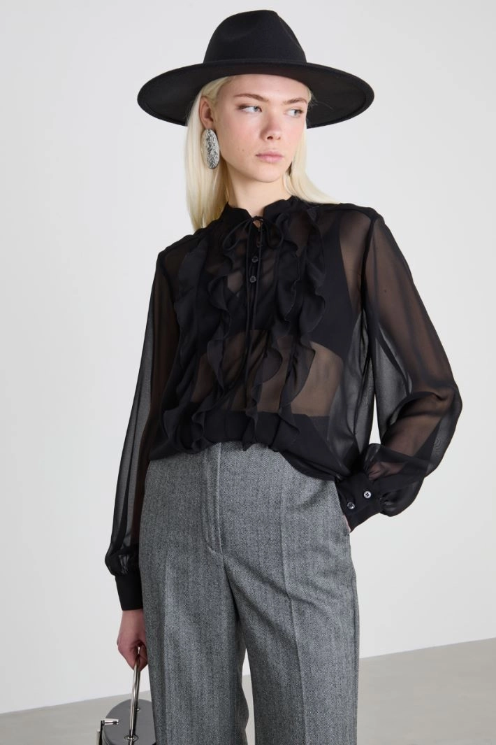 Straight-cut shirt in pure silk georgette with ruffles on the front, stand-up collar with ribbons to tie and long sleeves with cuff and button. Button fastening.