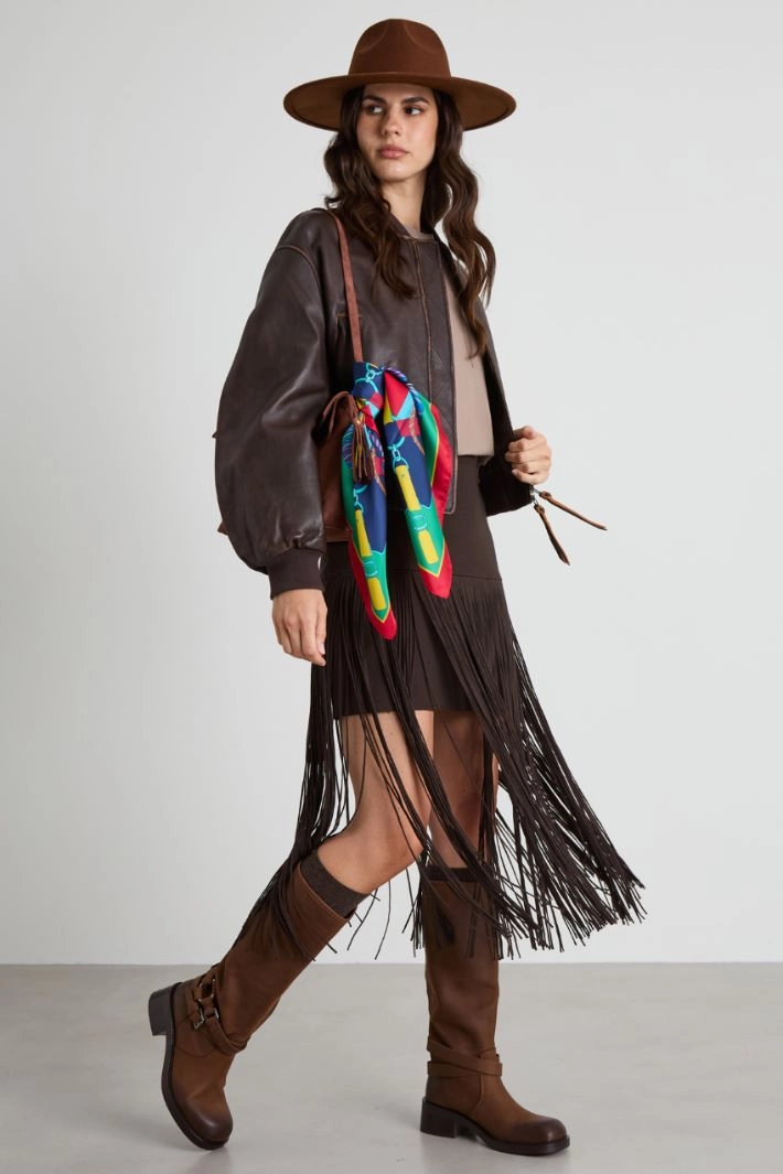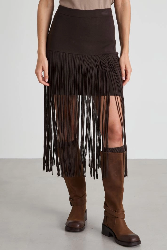 Short, tight-fitting skirt in viscose blend knit, with an elasticated waistband and fringed hem.