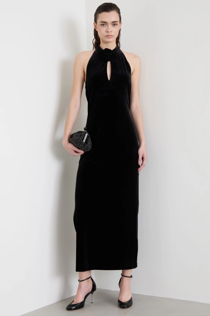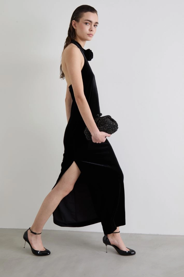 Long dress with a flowing line in stretch velvet jersey, with an American neckline finished with a teardrop opening, side slit and fastening with buttons on the neck. Matching flower brooch. Partially-lined.