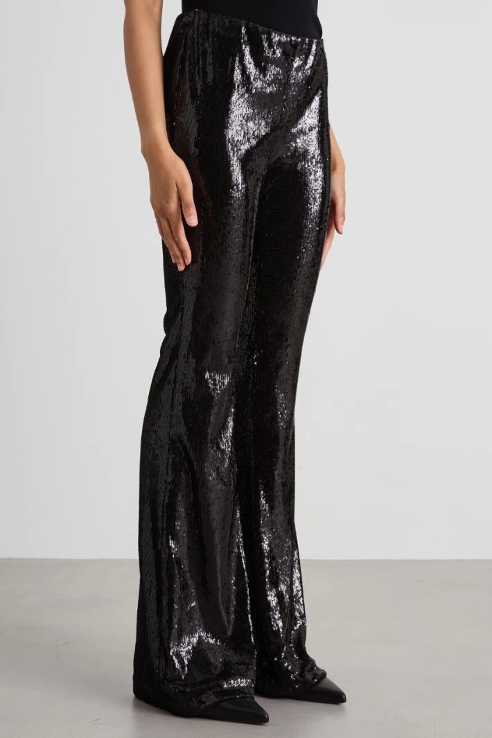 Flare trousers in jersey with sequins and elastic waistband. Lined.