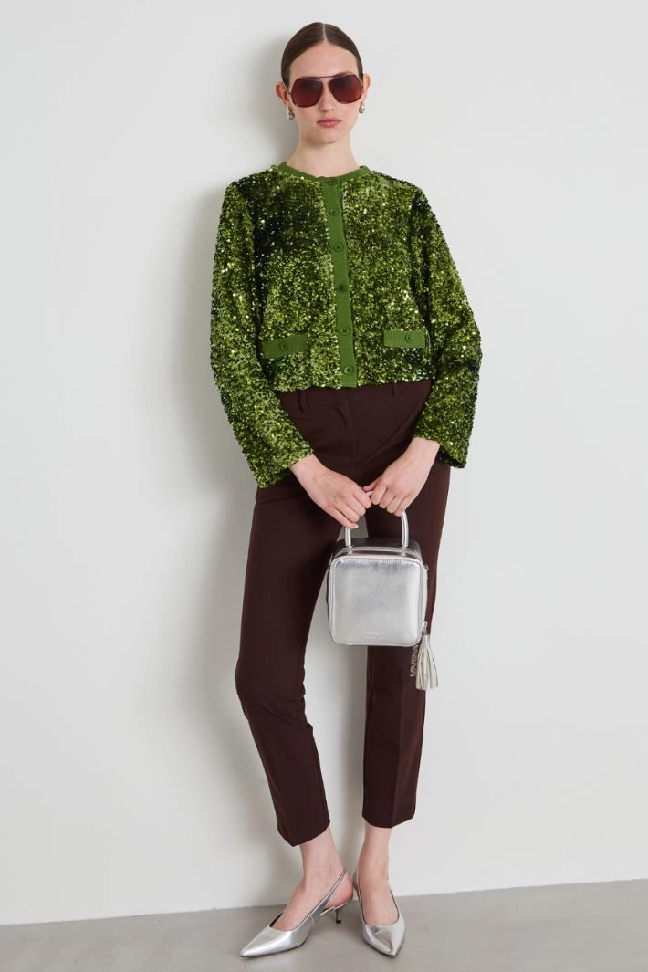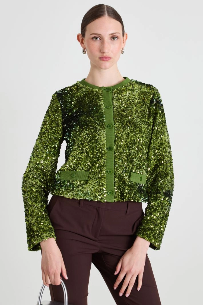 Straight-fit chenille jacket with all-over sequins, crew neck, long sleeves and welt pockets. Button fastening. Lined.