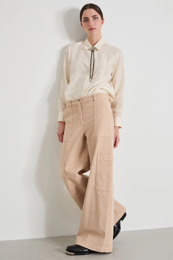Flowing shirt in pure washed silk fabric, with classic collar, long sleeves with cuffs and buttons, yoke cut with box pleat on the back and visible button fastening.
