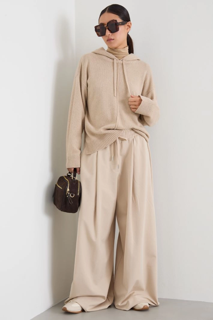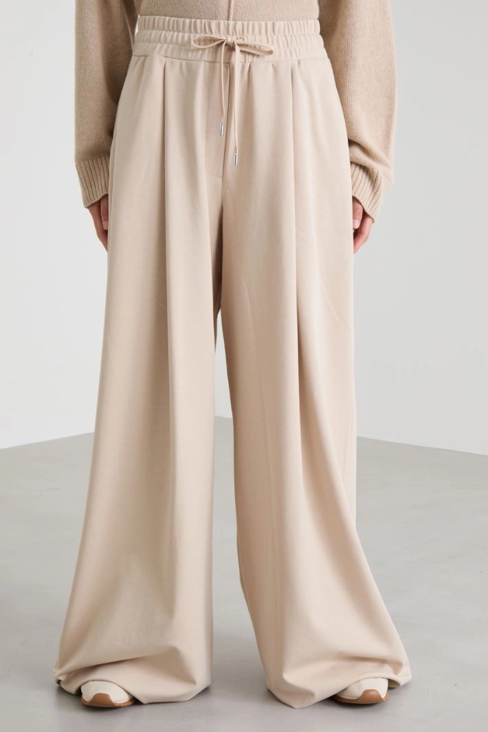 Loose-fit trousers in cotton blend jersey, with elastic insert and drawstring at the waist, pleats and French pockets.