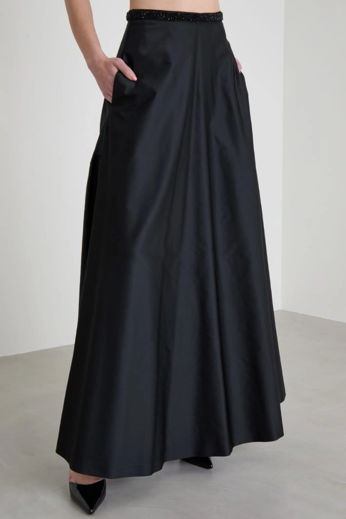 Long flared skirt in heavy cotton-blend duchesse, with matching crystal motif embroidered at the waist, side pockets inset in the seams and a flounce motif at the back. Invisible zip fastening at the side.