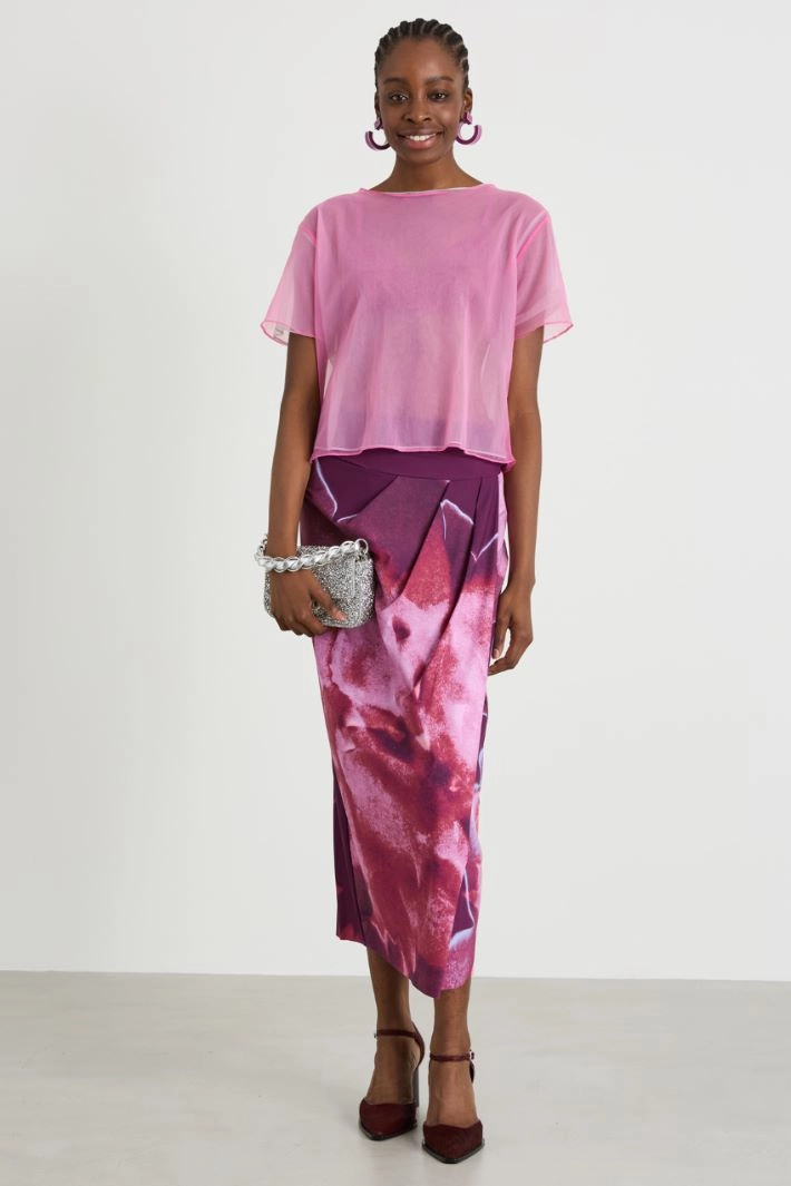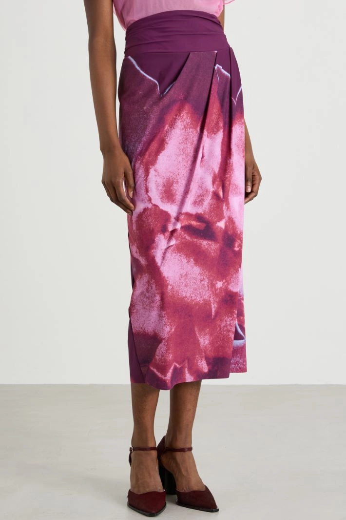 Loose fit jersey skirt with draping and a wrap cut on the front.