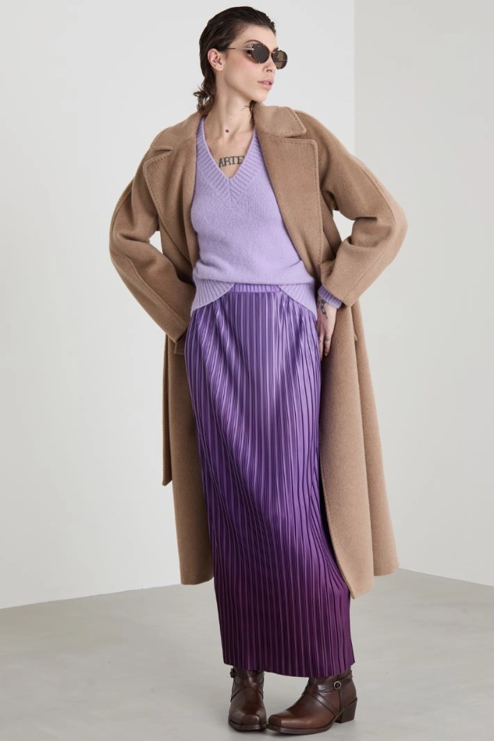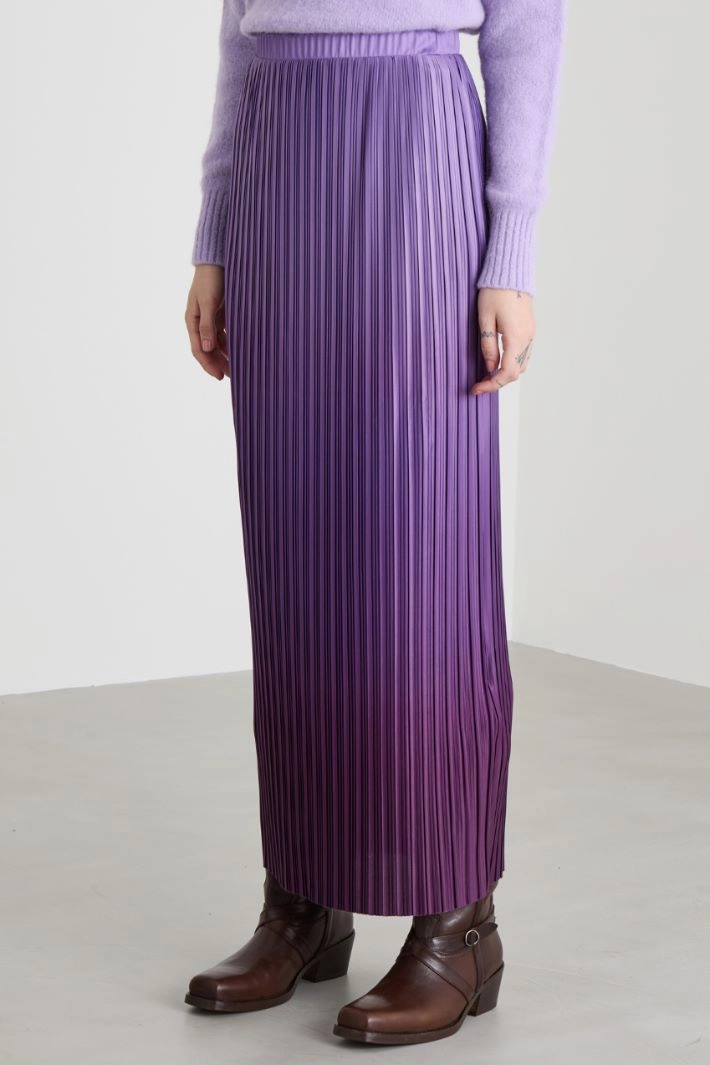 Long pleated satin skirt with a straight and flowing line, shaded print and elastic insert at the waist.
