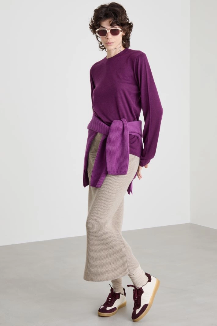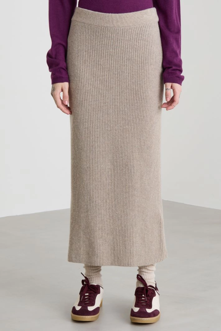 Midi skirt in viscose and wool blend knit, with ribbed knit, elasticated waistband and side slit at the bottom of the garment.