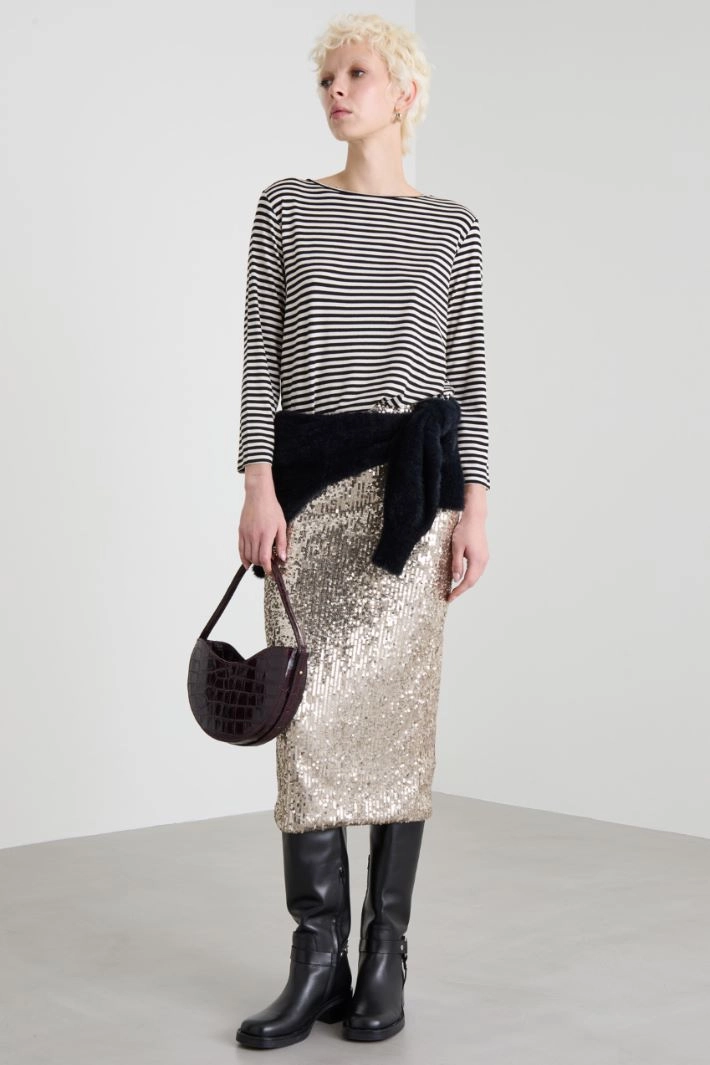 Longuette skirt in jersey covered in sequins, with elastic insert at the waist. Lined.