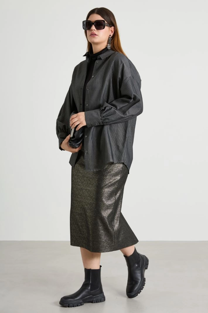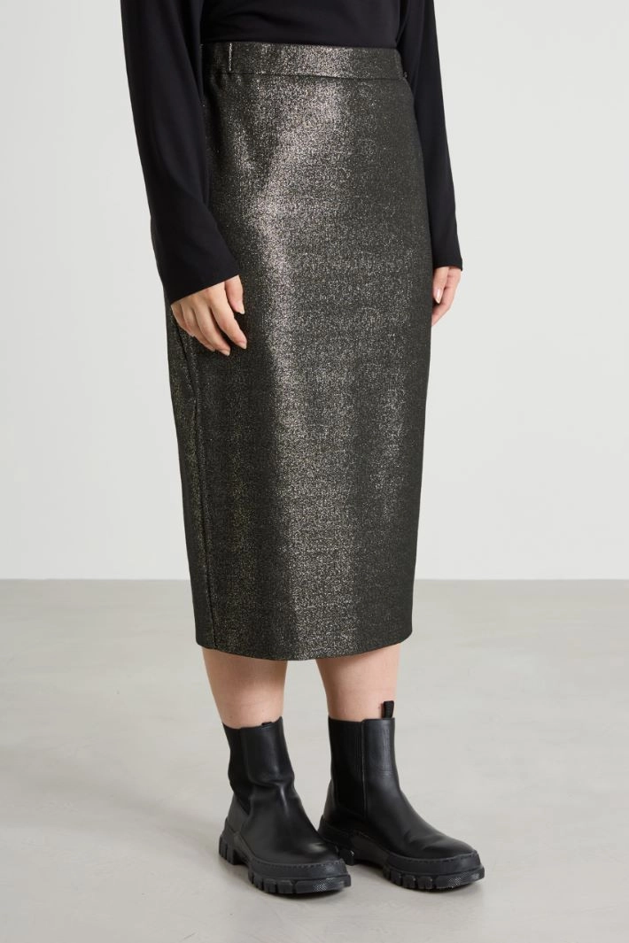 Pencil skirt in stretch cotton lamé fabric, with elastic waistband and central slit on the back. Invisible zip fastening on the back. Lined.