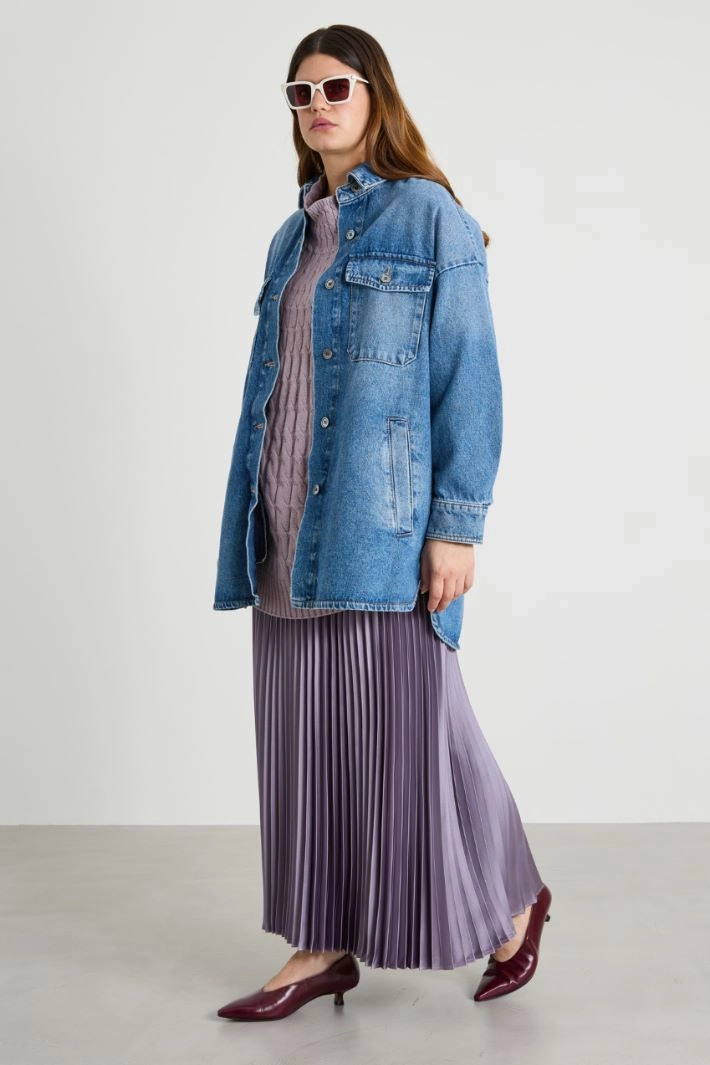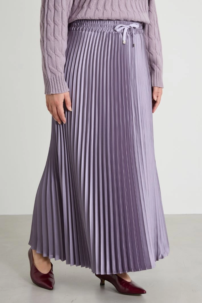 Loose, flared skirt in pleated satin, with elastic insert and drawstring at the waist.