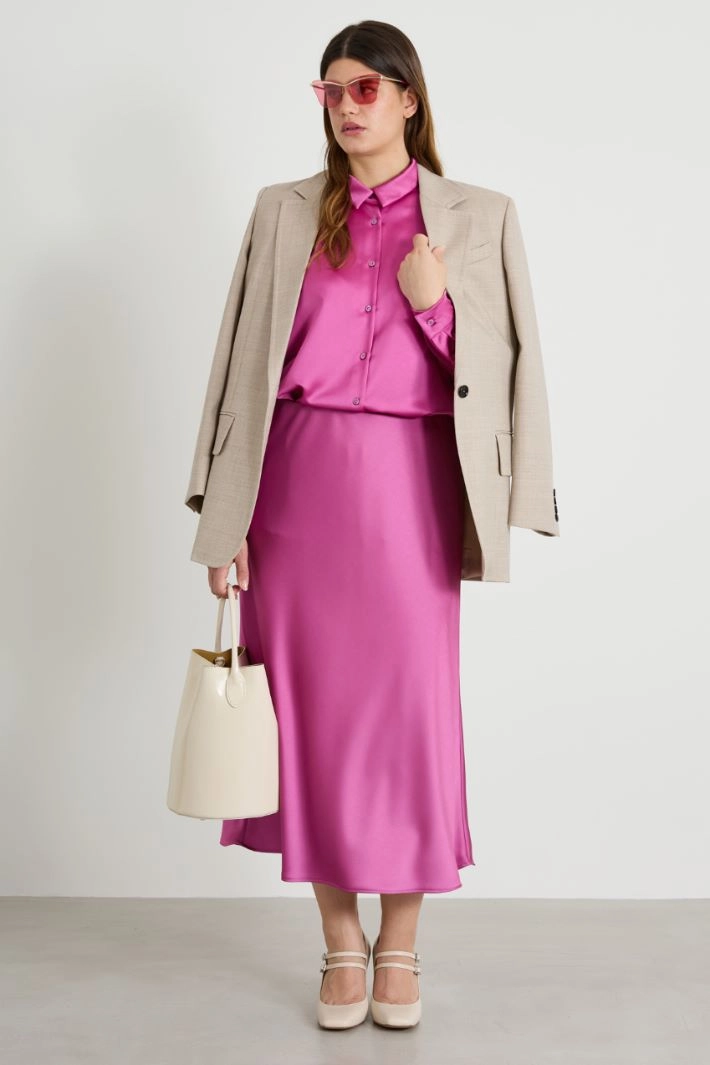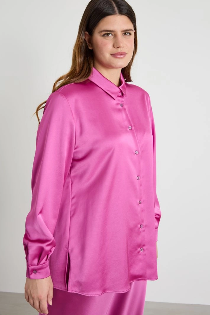 Flowing satin shirt with classic collar, long sleeves with cuff and button, and button fastening.